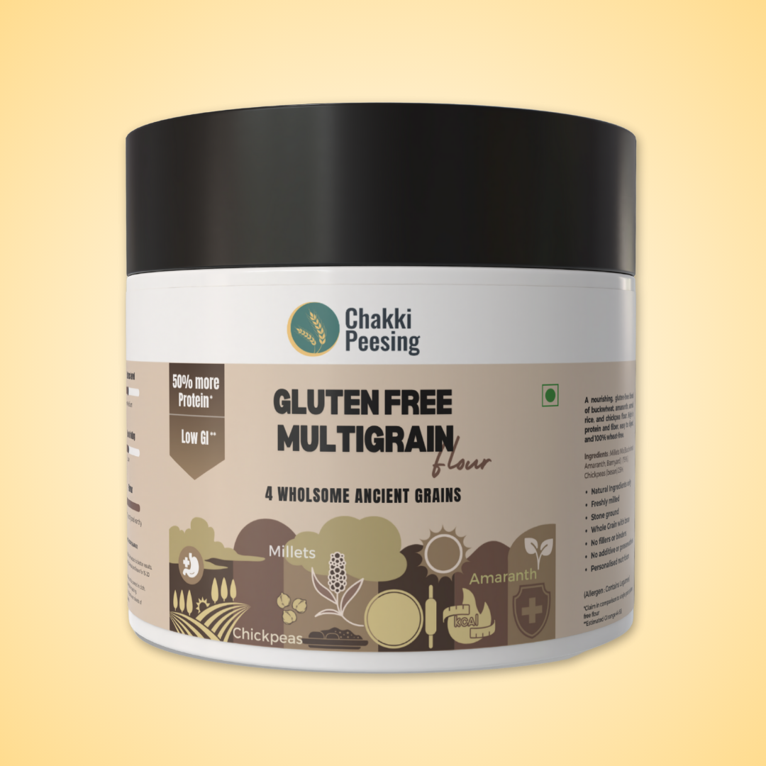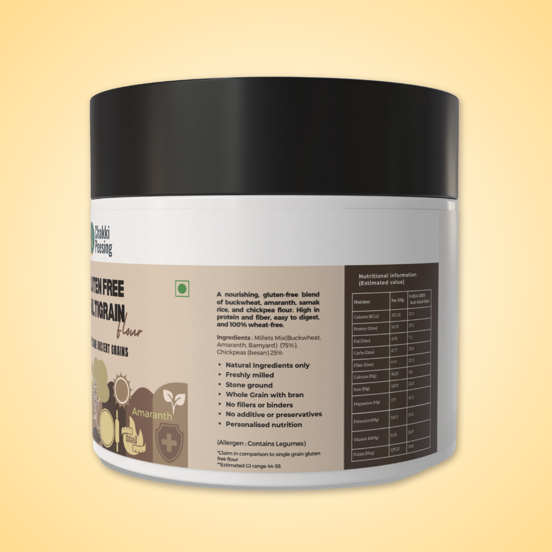 Enjoy the wholesome goodness of our Gluten-Free Multigrain Atta, a nutritious blend of buckwheat, amaranth, samak rice (barnyard millet), and besan (chickpea flour). This wheat-free, stone-ground atta is freshly milled retaining whole grain bran, packed with 50% more protein and rich in fiber and essential minerals. Perfect for gluten-sensitive individuals and fasting diets, it supports digestion, steady energy release, and overall wellness.