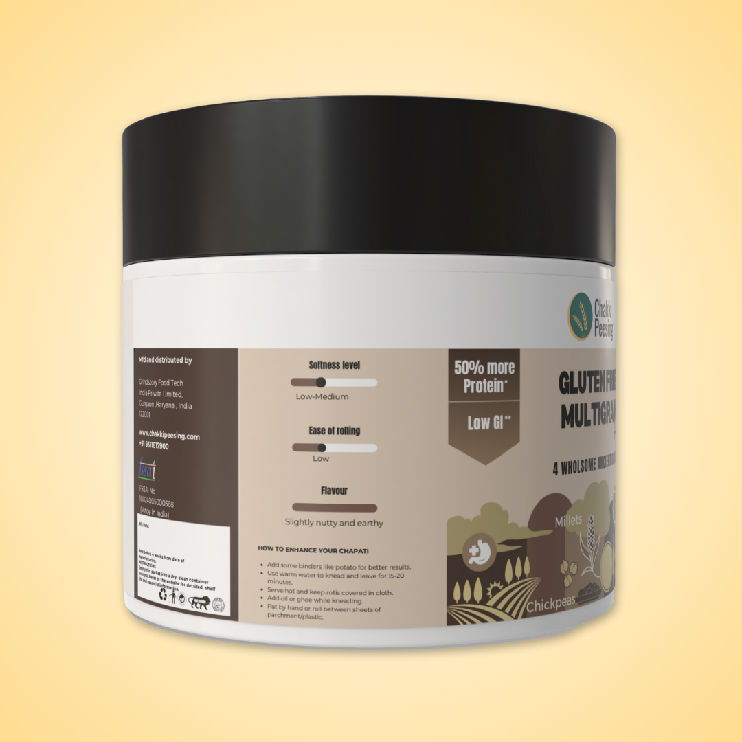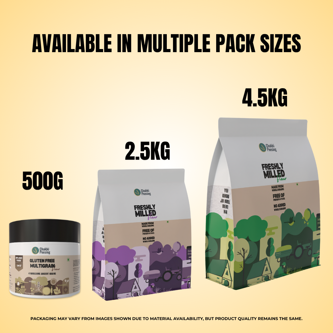 Our atta contains natural ingredients only — no fillers, binders, additives, or preservatives — delivering clean, personalized nutrition. Ideal for making soft nutty rotis, cheelas, and thalipeeths, best enjoyed with ghee or curd. The dough is best patted or rolled between sheets for perfect results every time.